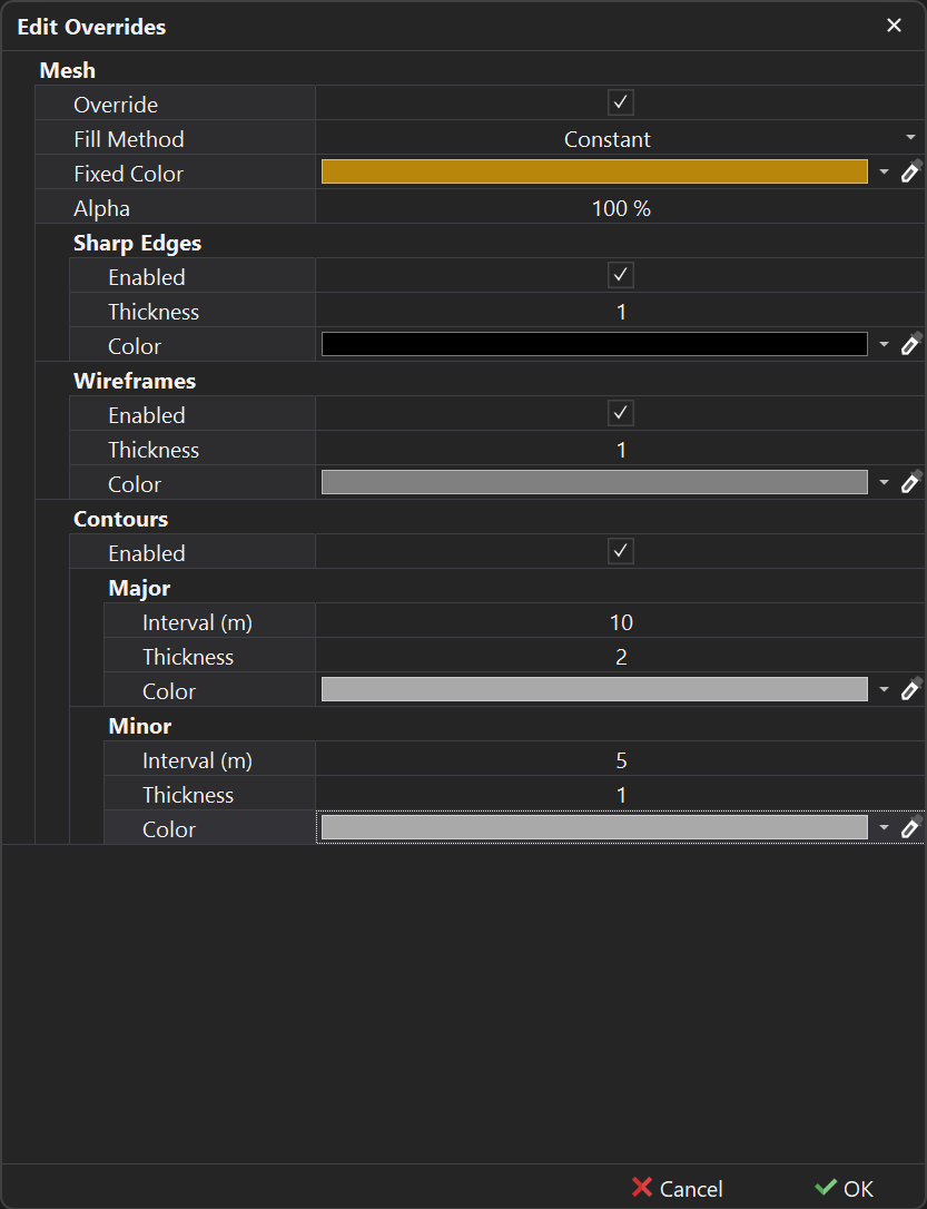 | Contours | The Contour setting visualises the elevation or depth changes within the mesh, enhancing the understanding of the model's topography. This feature is particularly useful for analyzing terrain features and gradients, making it easier to assess landforms, slopes, and other geological characteristics that may impact design or operational decisions.
