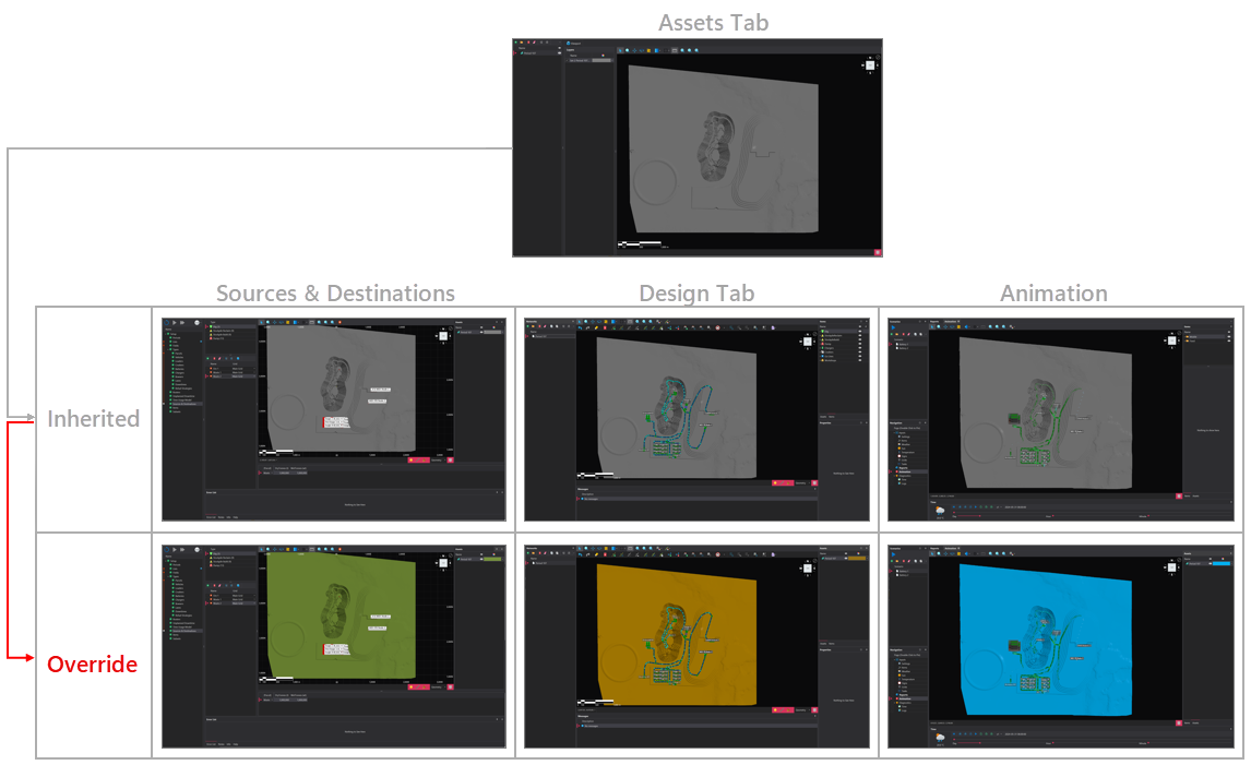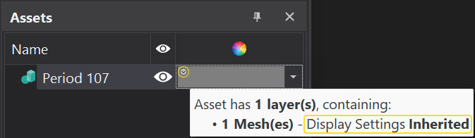 The default appearance of layers is configured in the Assets tab, and these settings are inherited by the layers throughout the software. However, appearance settings can be overridden in any downstream viewport if necessary. This workflow is shown in the image below. This page contains information relevant to both the initial appearance settings, set in the Assets tab, and any subsequent viewport within the software.