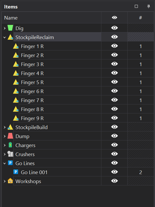 | Visiblity | Featuring an eye icon, this icon controls the visibility of the item in the viewport. If the item is in the hidden state, the icon will have a diagonal line through it. |