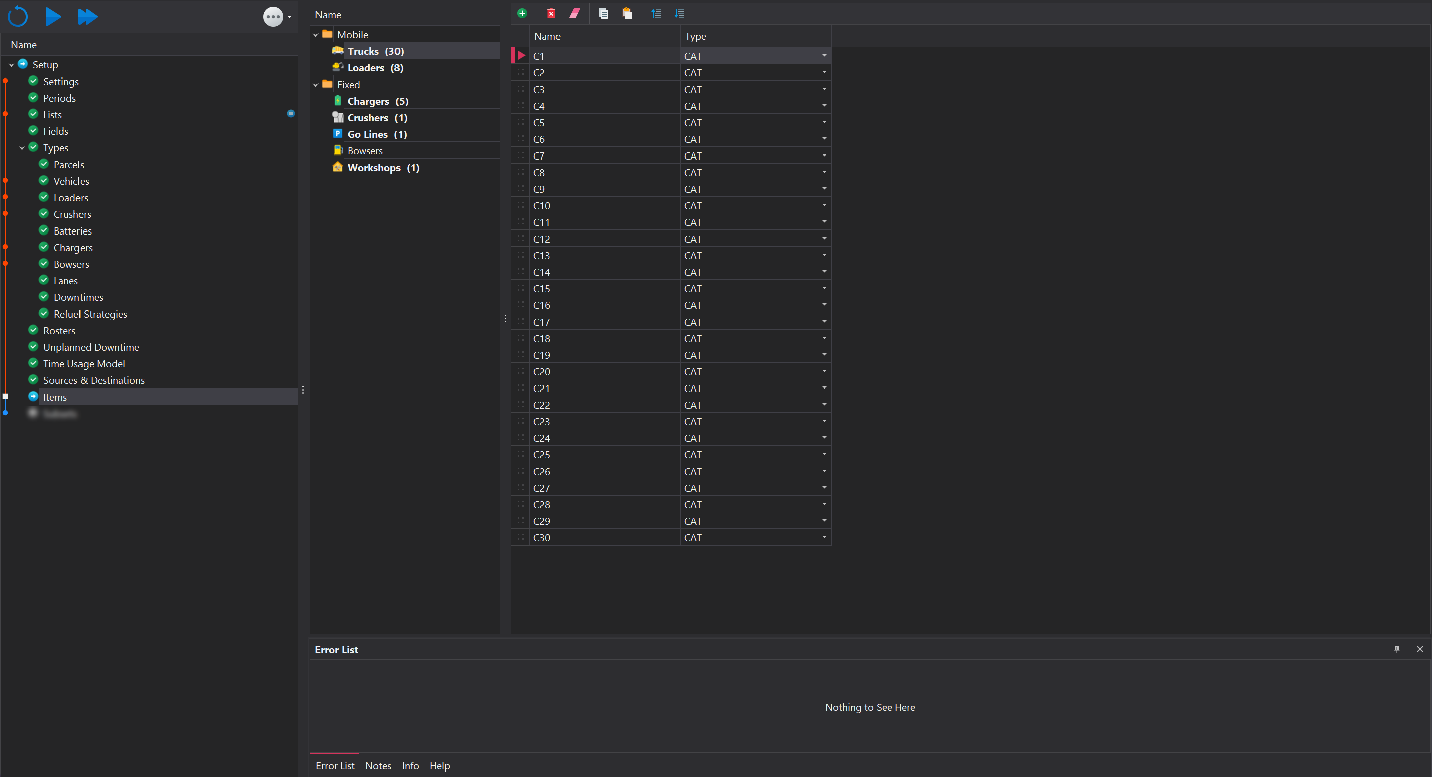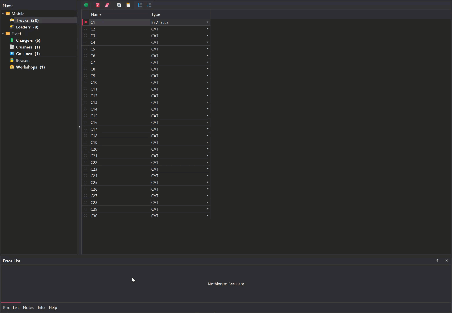 Mobile items are equipment that can move within the simulation. Currently, the only mobile items available are trucks and load units. To manage mobile assets, use the toolbar located at the top to add or remove items. When adding a new item, the following two properties need to configured.