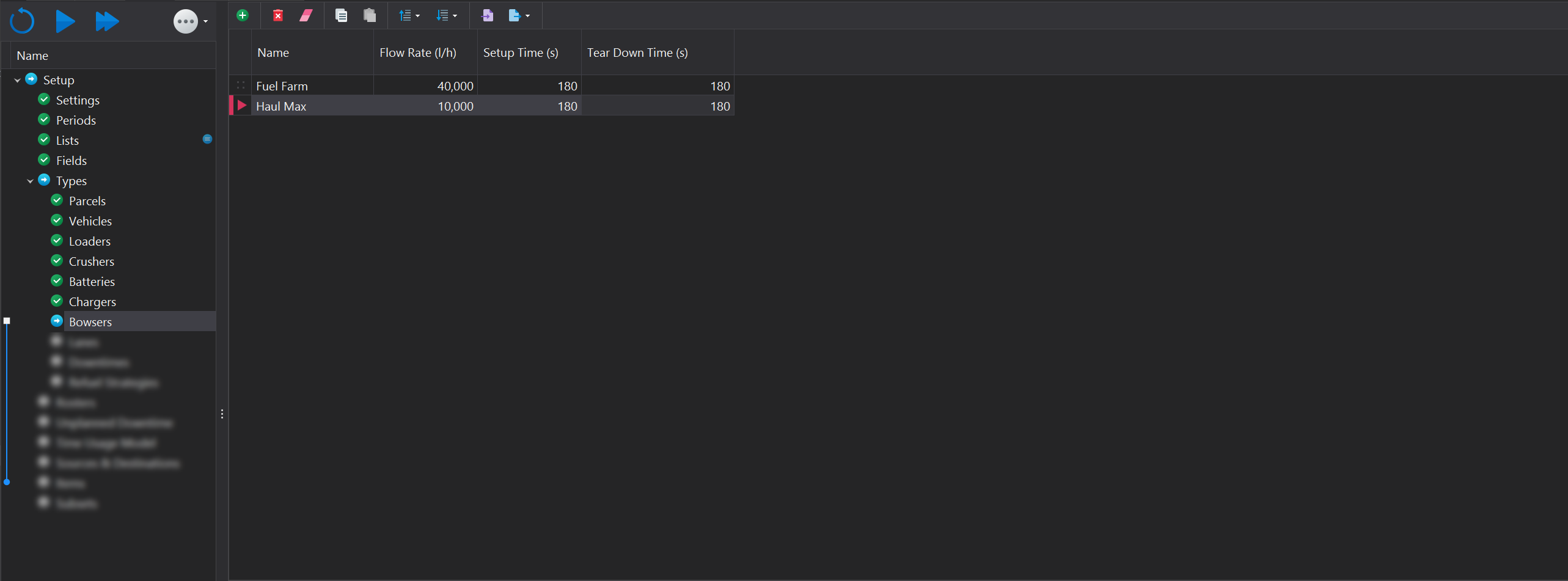 In the Bowsers step, you can define the types of fuel bowsers to be modeled in your simulation. This step focuses on specifying 'bowser types' rather than individual on-site bowser instances. Later in the software, the site specific instances are created where they are mapped to a defined bowser type.