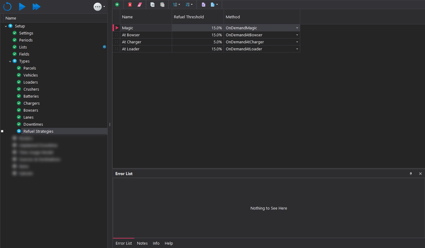 A refuel stratergy controls how and when refueling happens for equipment. Different refuel stratergies can be tested when running simultations.