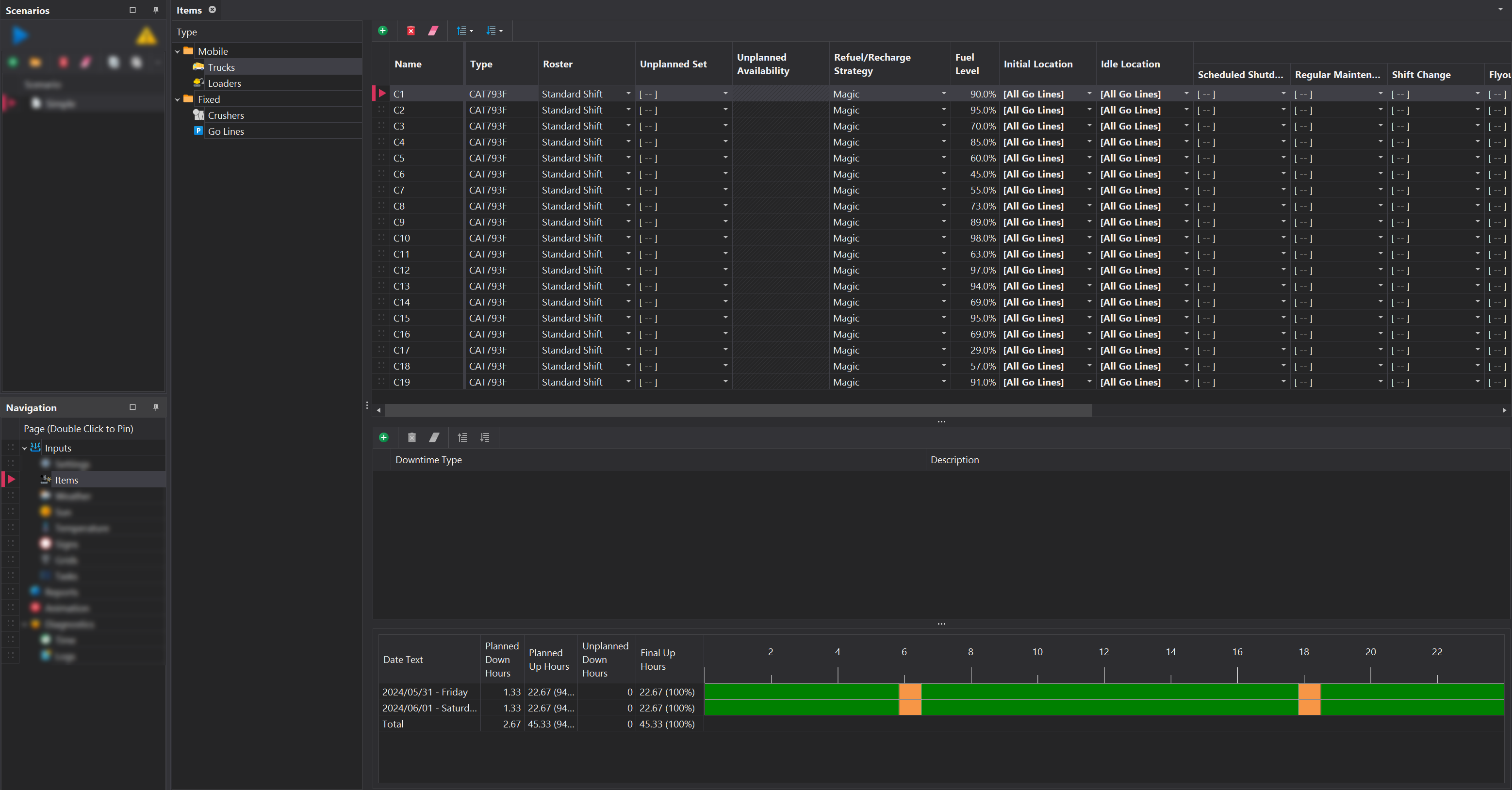 The Items input tab allows you to select the assets, defined in the setup, that will be included in the simulation. Items are organised into two main categories: Mobile and Fixed.