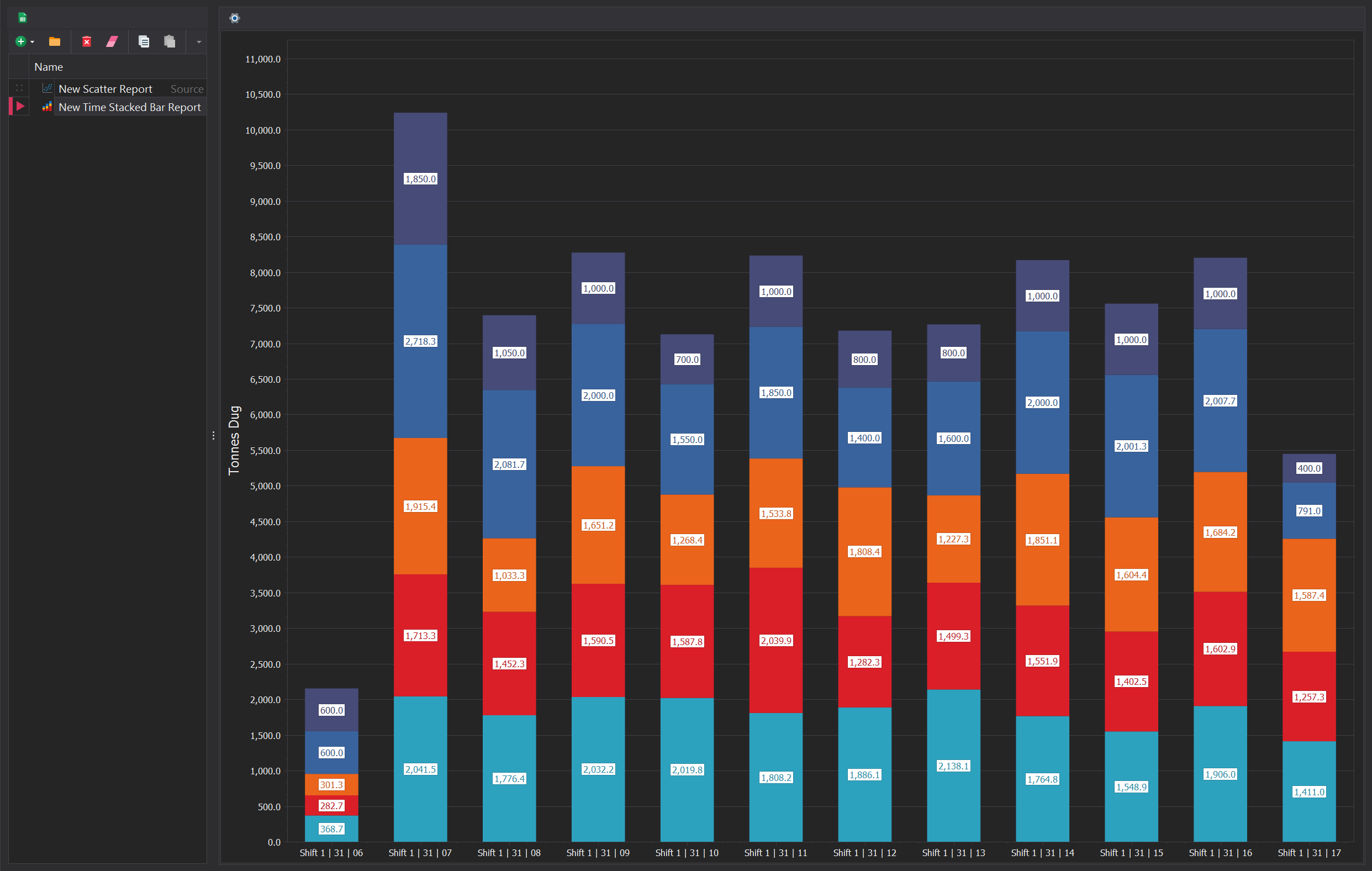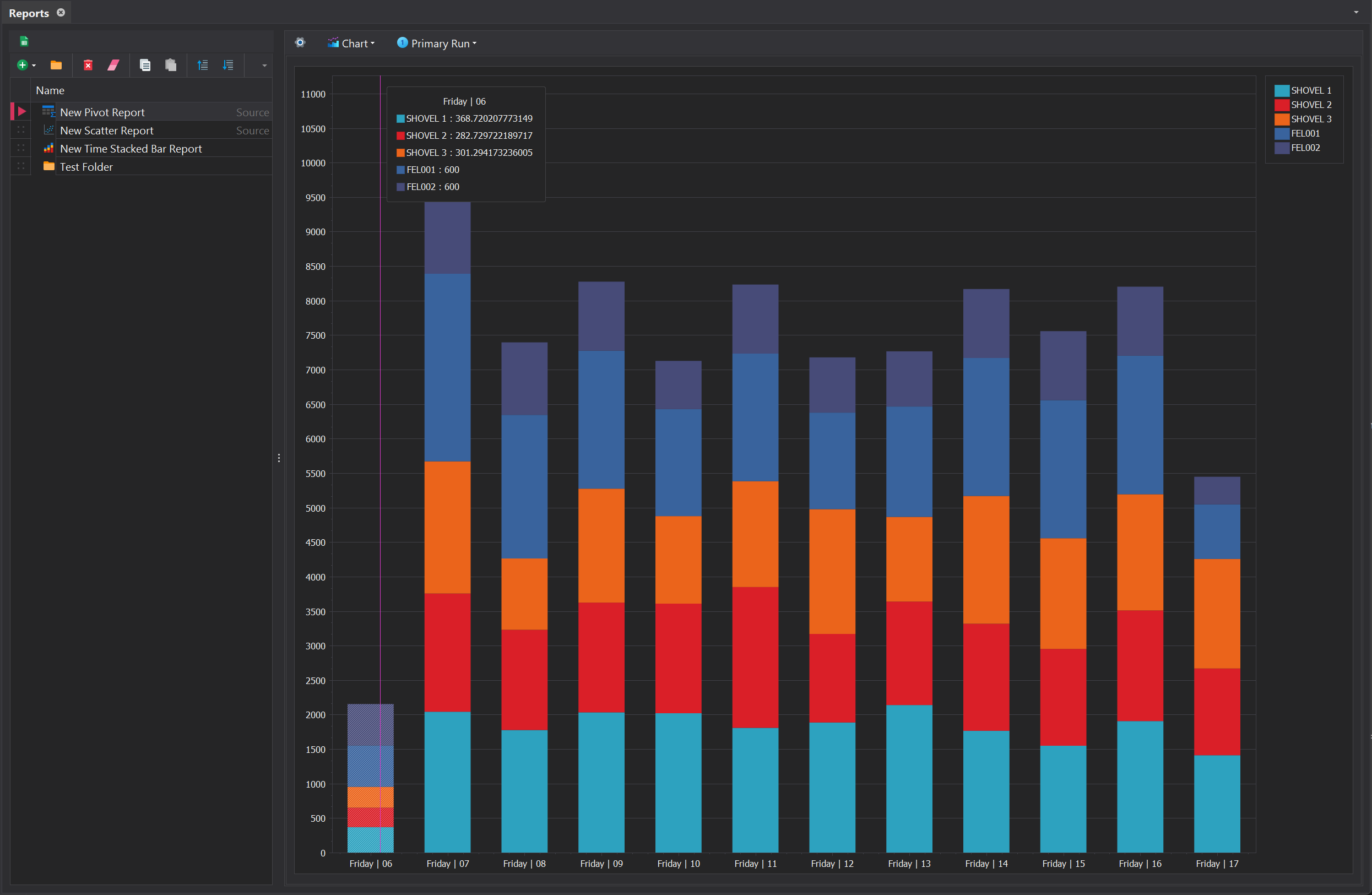 A Time Stacked Bar report is a type of chart that displays data over a sequence of time intervals, breaking each interval into stacked segments representing different categories or components. It provides a clear visualisation of how total values change over time and how the contributions of individual components compare within each time segment.